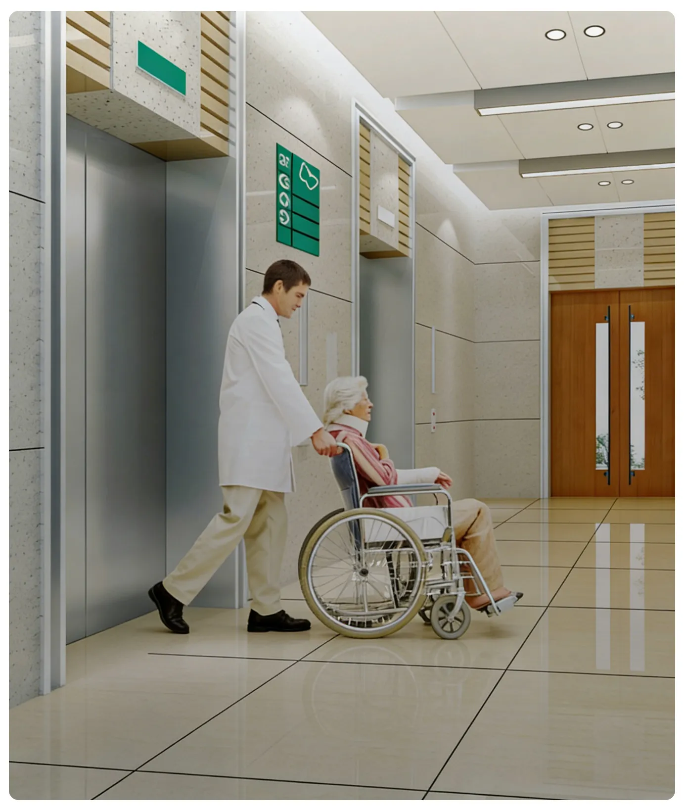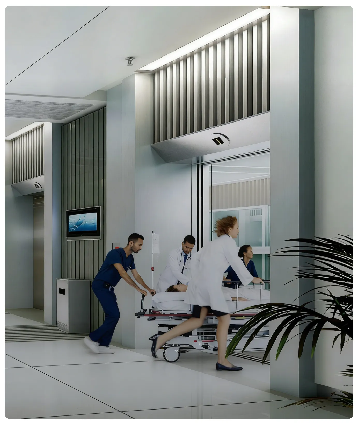 Uses the open double folding door system, depthcapsules space design, to maximize the elevatordoor, convenient sickbed more freely in and out ofthe elevator.